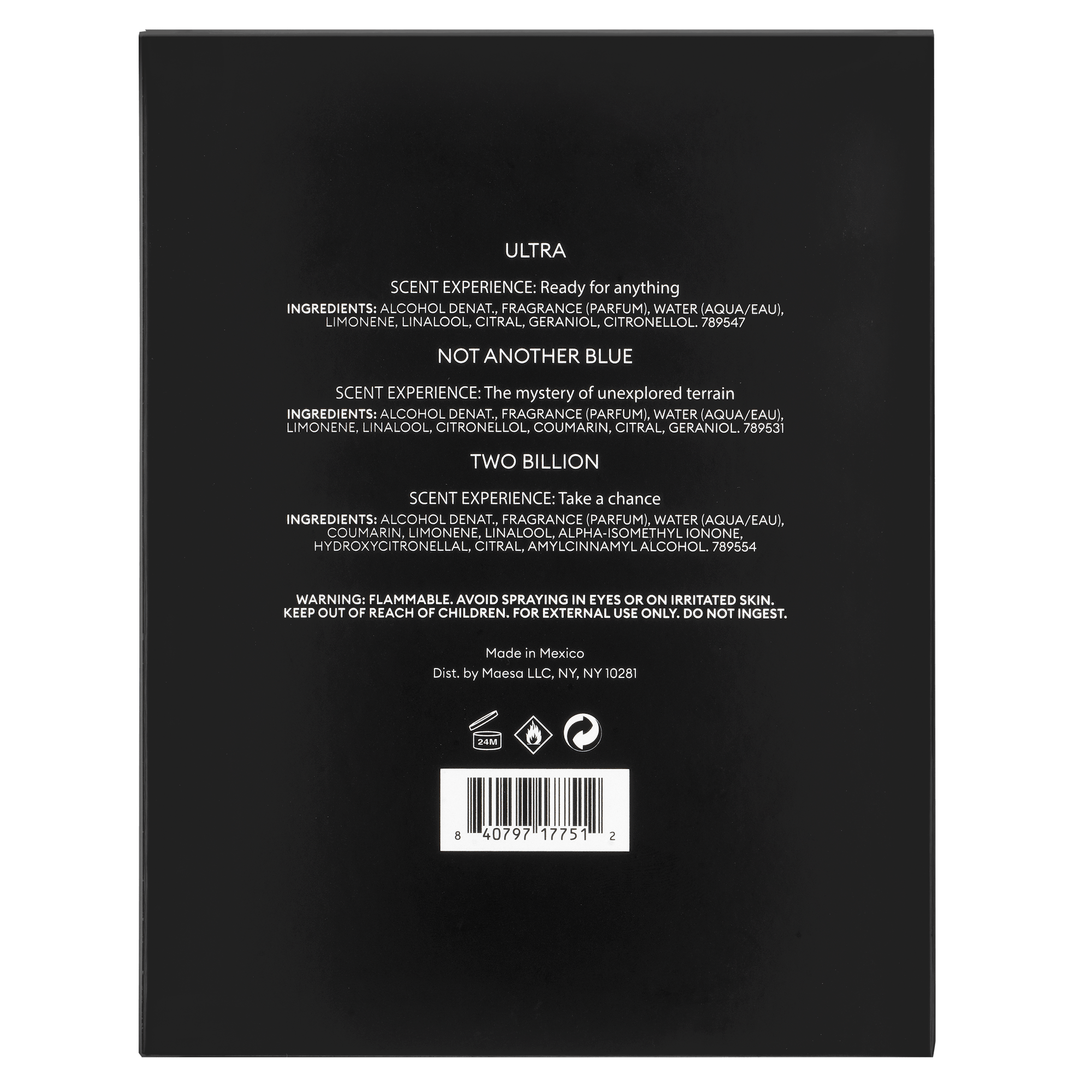 Ultra smells like: Black Pepper, Fresh Bergamot, Pineapple. Not Another Blue smells like: Elemi, Dry Vetiver, Amberwood Two Billion smells like: Lavender, Cedarwood, Tonka Bean"